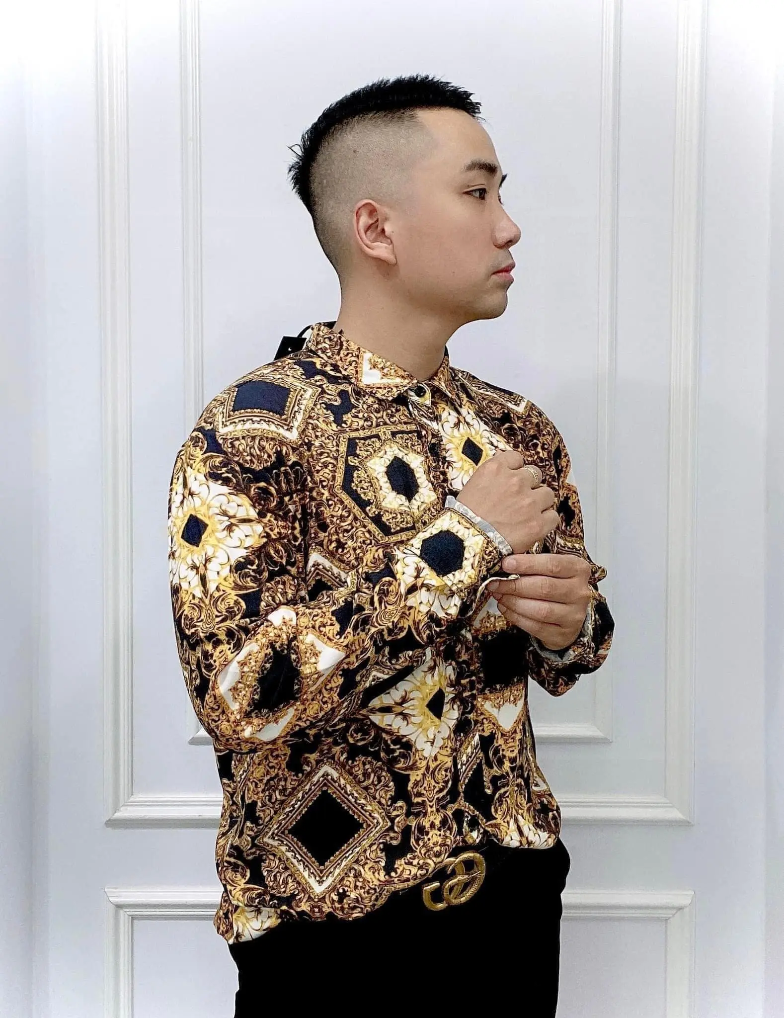 Chiếc áo sơ mi này có thiết kế bắt mắt với các họa tiết phức tạp màu vàng, đen và trắng, mang đến cảm giác sang trọng, theo phong cách baroque.